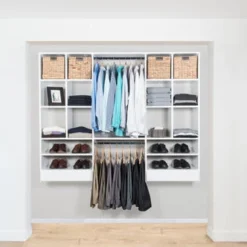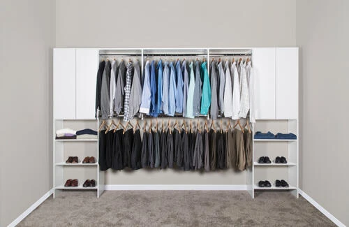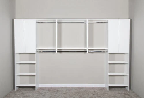 The Dakota Closets™ 136″ W x 86-1/2″ H White Wooden Closet provides a wide array of storage solutions. It features 6 wardrobe rods for hanging storage and 2 cabinets for concealed storage.