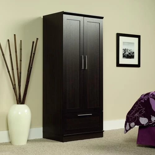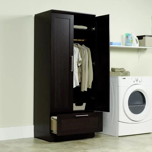 This sleek and stylish cabinet from Sauder® is the perfect accent to any bedroom and a great storage solution for almost any room in your home. The large shelving area gives you plenty of space for your folded clothing, while a garment rod allows you to hang the rest. The bottom single drawer provides hidden storage. The attractive Dakota Oak® finish brings a modern look to any space.